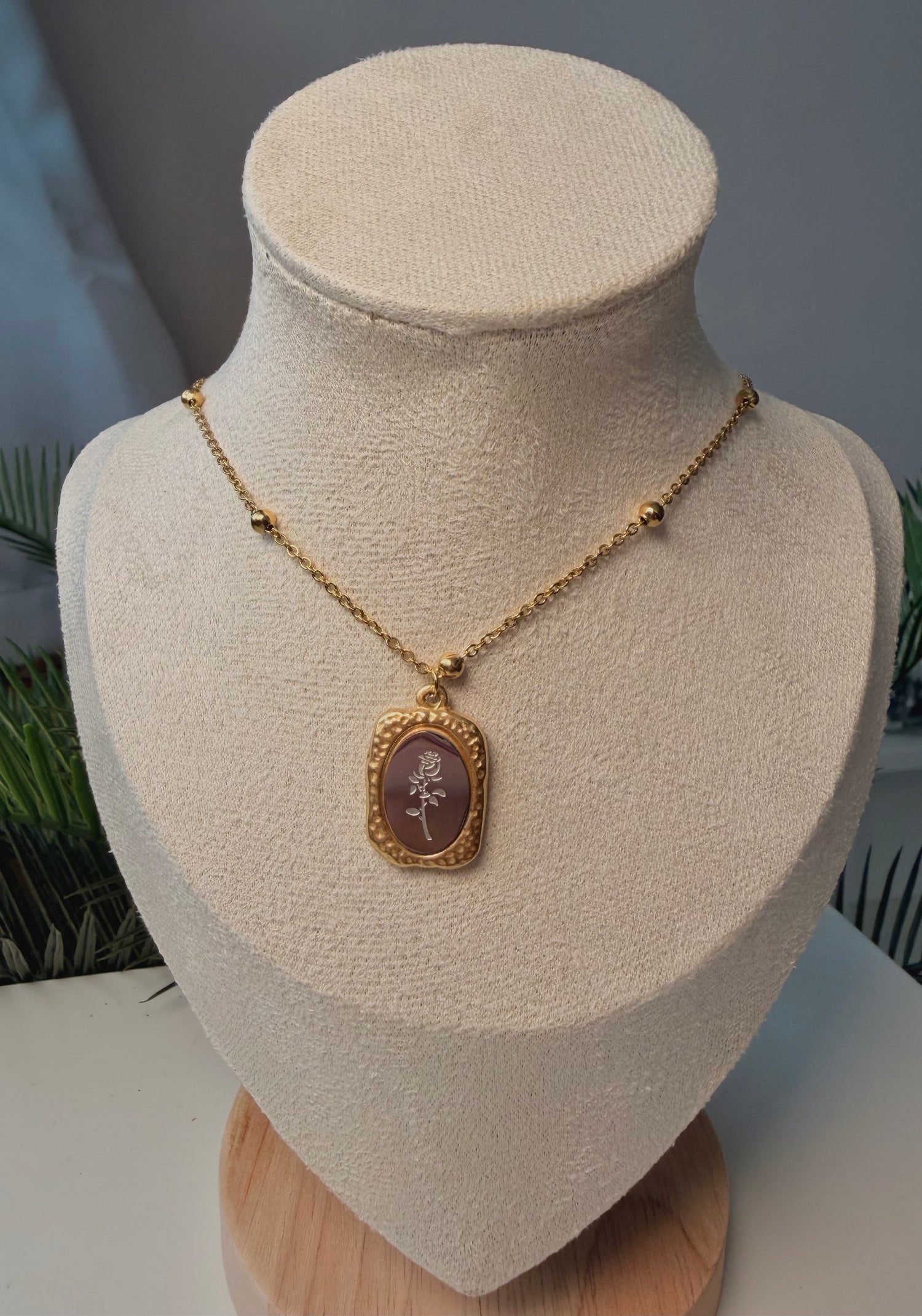 Cadena en stainless steel color dorada con chapa plata con una rosa